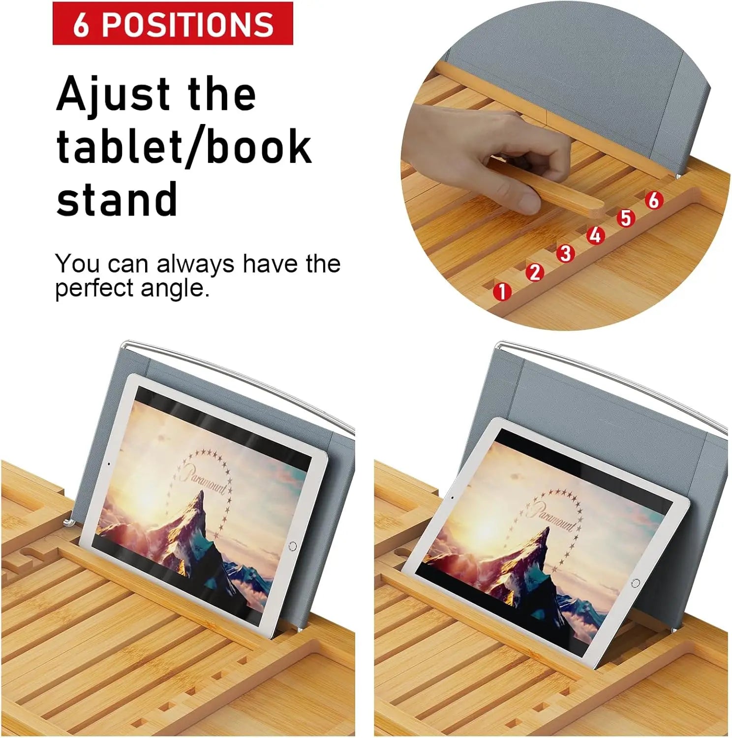 - Multi-functional design with six reading angles, wine glass holder, cup holder, phone slot, and two side-trays for all essentials within reach and at arm's length.