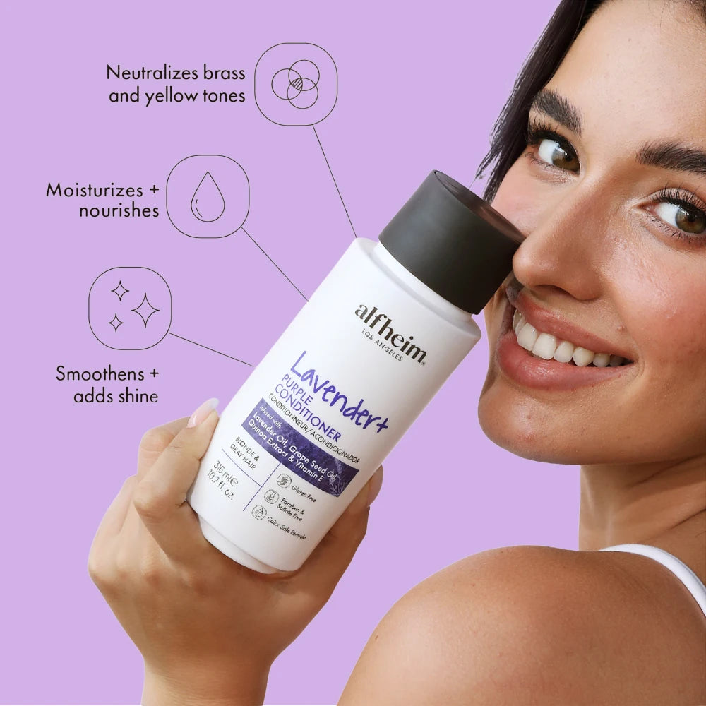 Revive vibrant, brass-free color for your blonde, lightened, or grey hair with the ALFHEIM Lavender+ Purple Shampoo & Conditioner Set.