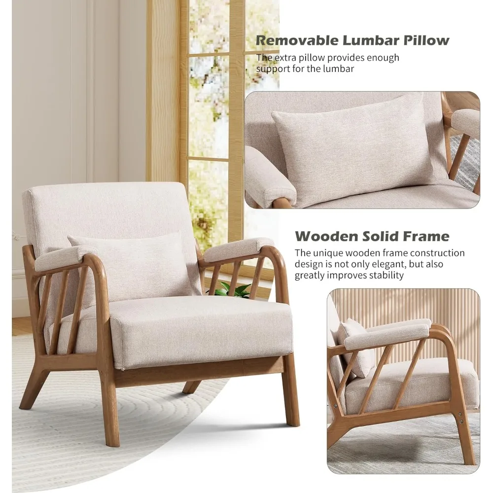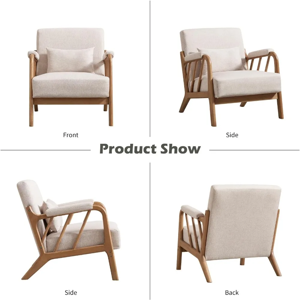 Mid Century Modern Accent Chair with Solid Wood Frame, Upholstered Living Room Chairs with Lumbar Cushion Padded Arms, Reading A