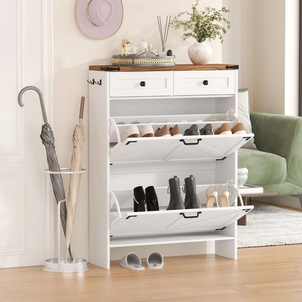 - 【Farmhouse & Simple Style】This shoe storage cabinet features a stylish and farmhouse design, with 2 storage drawers and 2 flip drawers, perfect for placing in the entryway, hallway, living room or porch, provides a neat looking in your home and space saving.